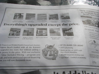 In the middle of a financial melt-down cause by the explosion of a world-wide real estate bubble, the Virginian Pilot – in its own little way - decides to throw gasoline on the inferno destroying the global financial markets. The ad below has run numerous times and is paid for by Franciscus Homes in Virginia Beach.